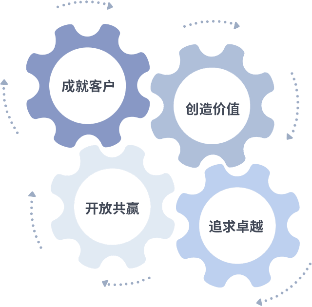 成就客户是一切决策的出发点,,,创造价值是衡量所有工作的标准,,,追求卓越是我们做事做人的态度,,,,开放共赢是我们的格局也是最终的结果。。。价值观的齿轮环环相扣,,,推动着组织里的每个人不断向前。。。