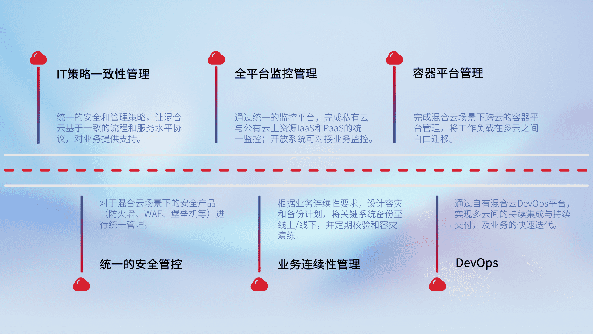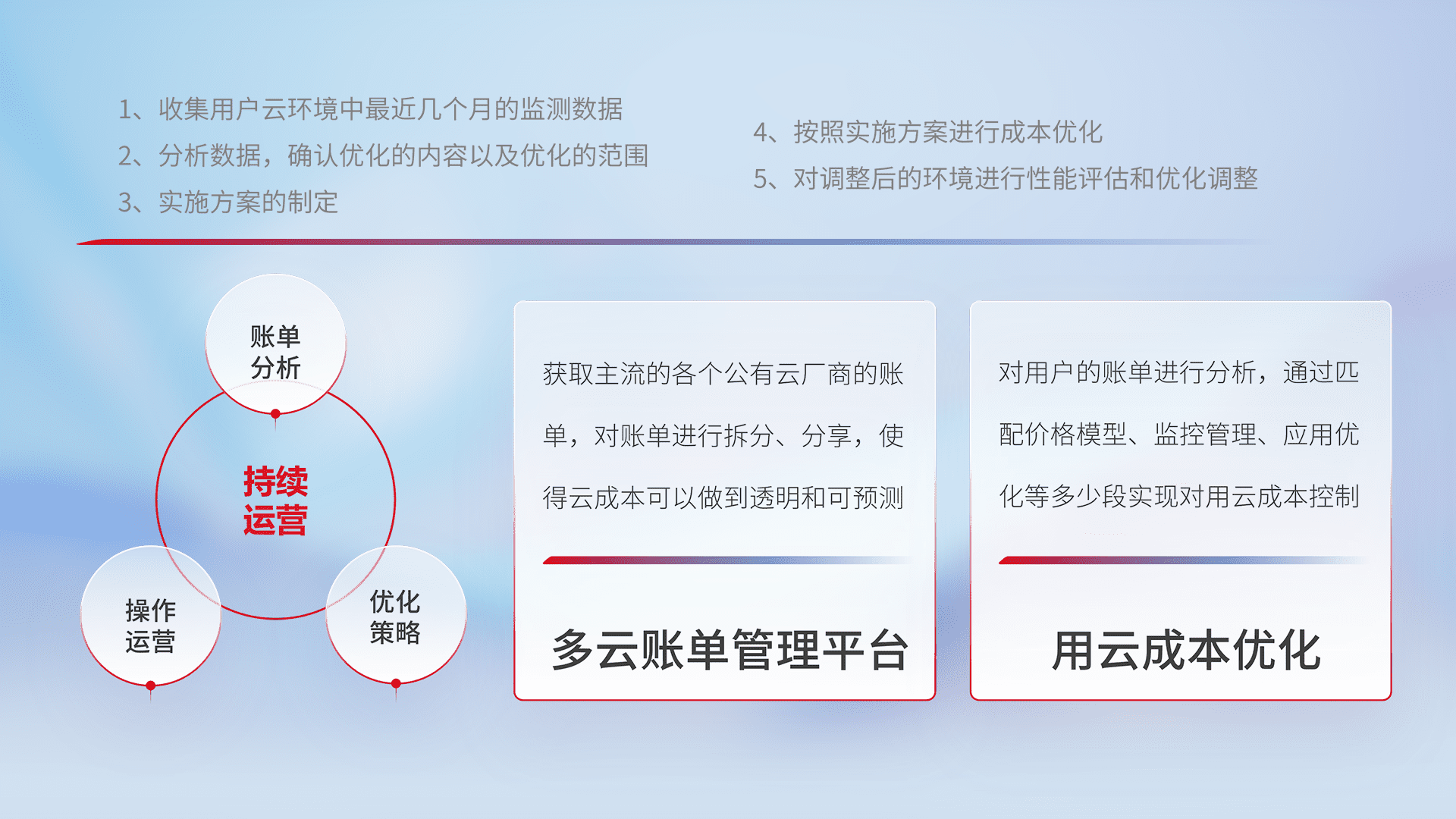 通过多云纳管,,,以统一的资源数据模型把客户的云资源进行抽象和封装,,,,进而实现对多云资源的统一操作,,,保障云资源管理的可靠性、、稳定性与可用性。。。。量身定制化运维内容,,,配置、、开发运维、、补丁管理、、、备份、、、监控、、、认证和访问管理、、审计和日常巡检等,,保障在用云过程中的可靠度,,,,稳定度以及高可用率。。